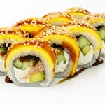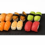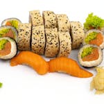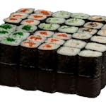 16 nigiri (4x łosoś, 2x tuńczyk, 2x węgorz, 2x łosoś opalony, 2x krewetka, 2x tamago, 2x mango), 6x hosomaki sake, 6x hosomak tuńczyk, 6x hosomak ogórek, 6x futomaki łosoś, 6x futomaki krewetka panko, 8x Dragon roll, 8x california paluszek krabowy, 8x california pieczony łosoś, 6x futomaki tuńczyk, 2x gunkan z tatarem z łososia, 2x gunkan sałatka wakame -